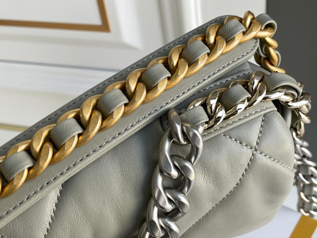 Piel de ternera irisada, metal dorado, plateado y acabado rutenio