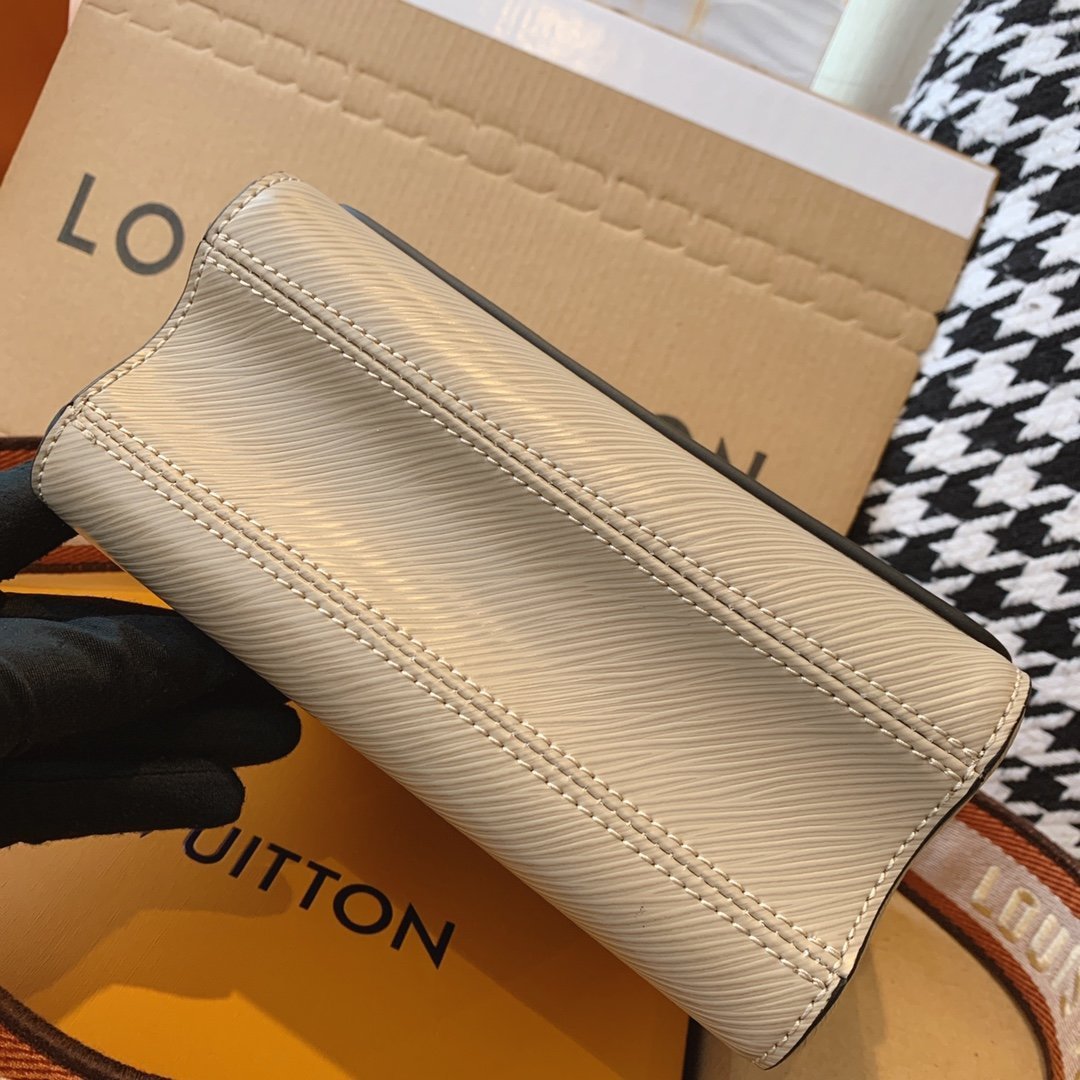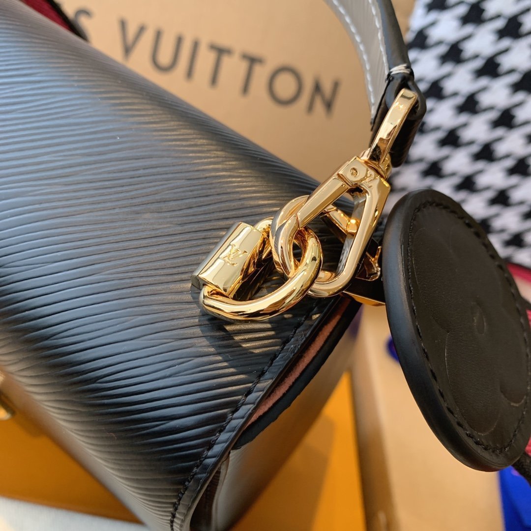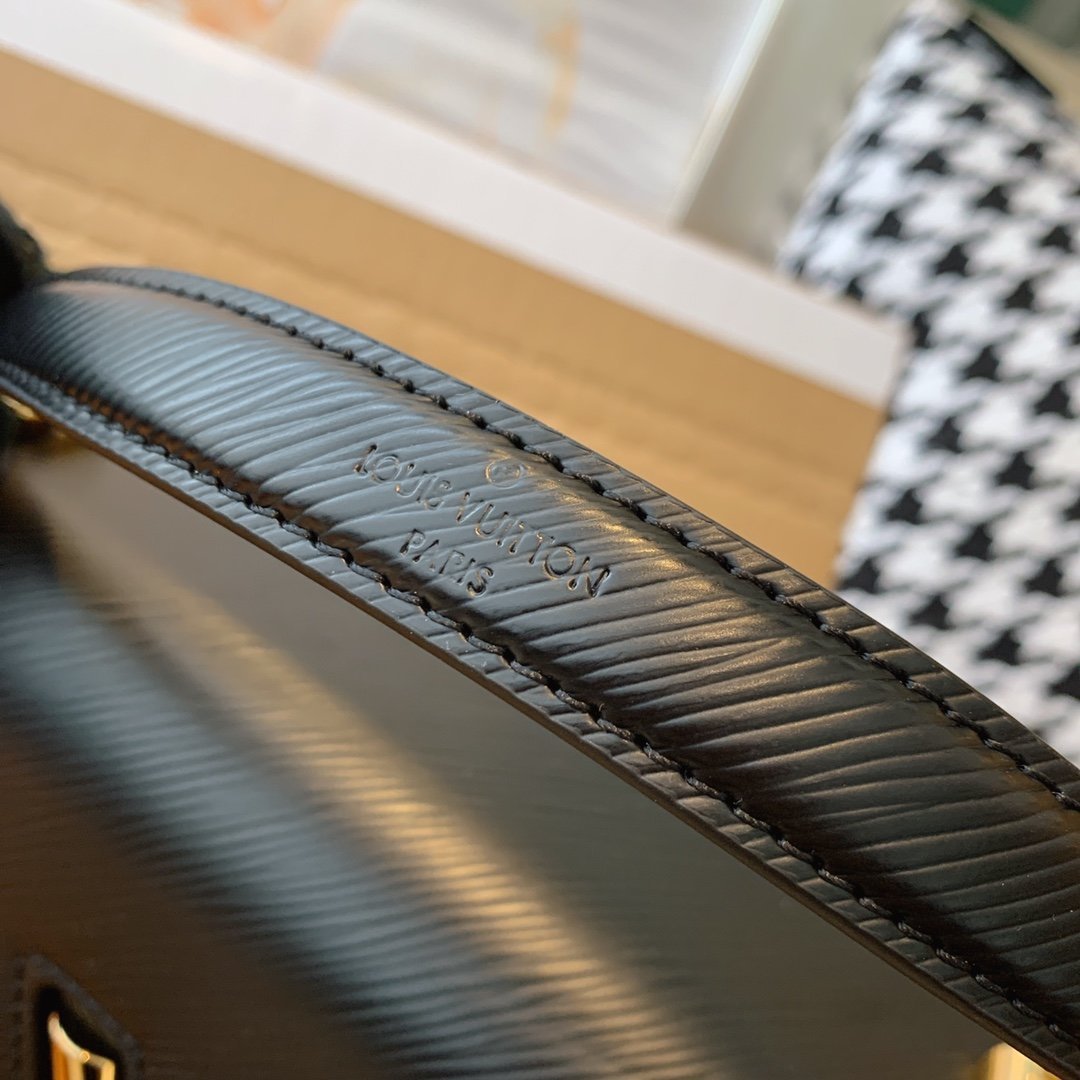 - Ribete en piel lisa, satén bordado y piel Epi