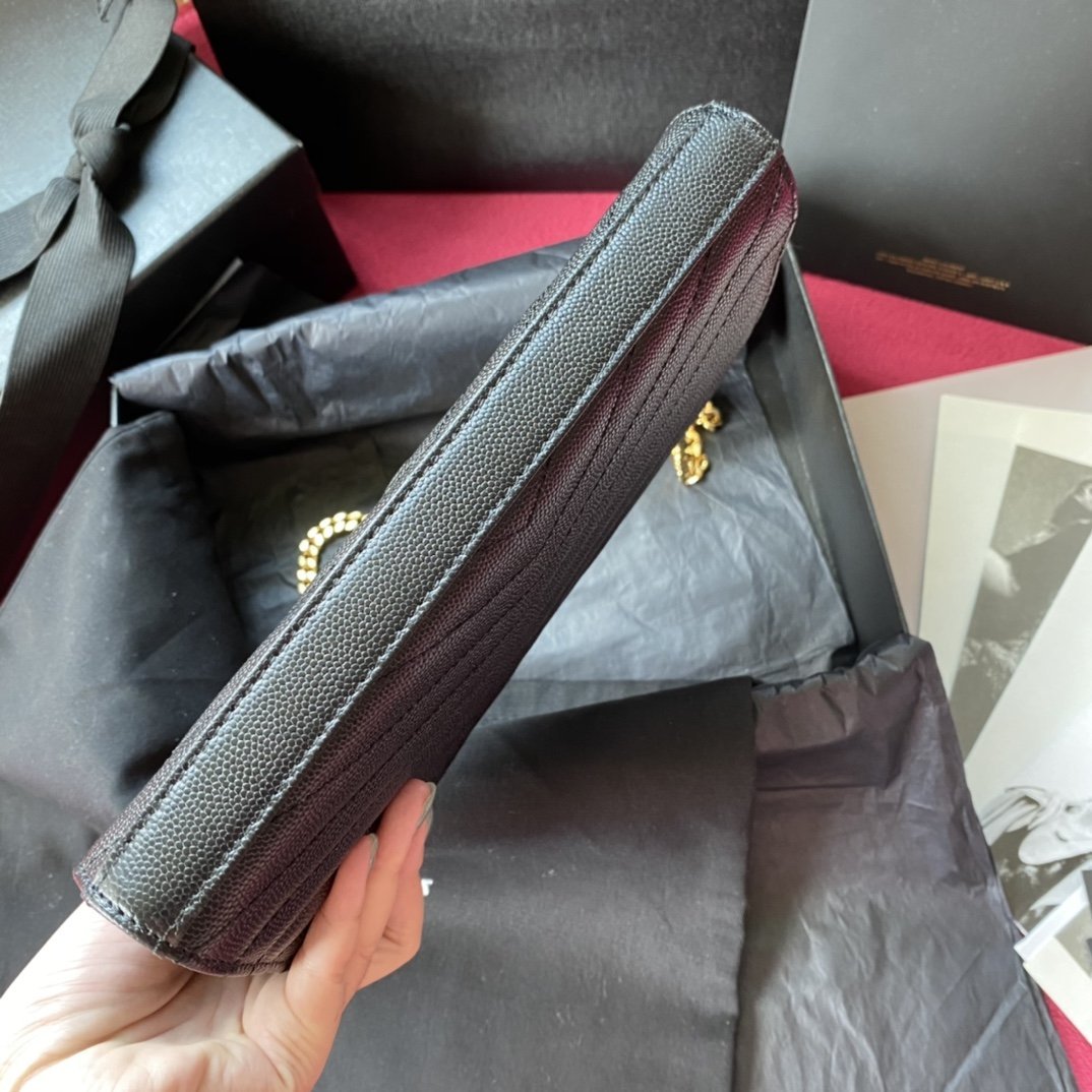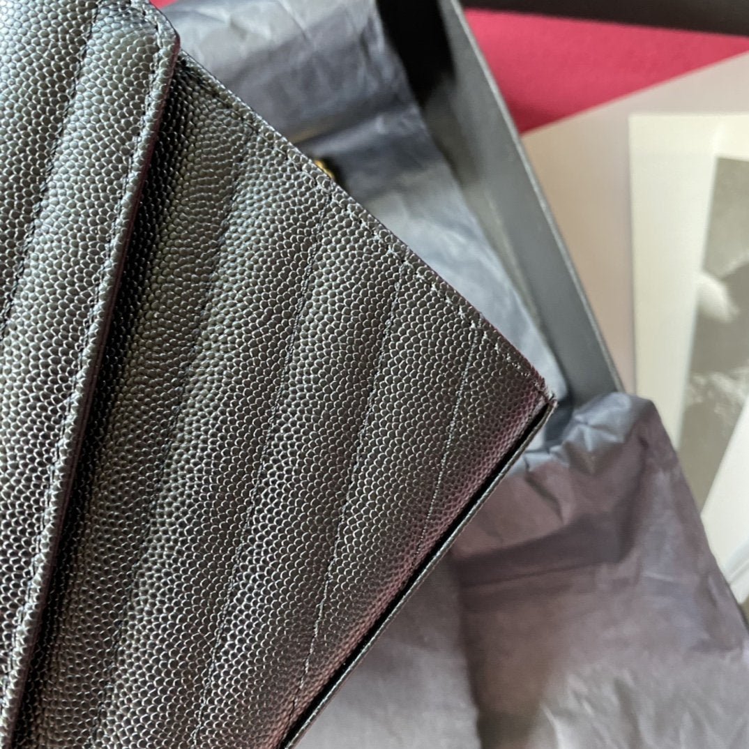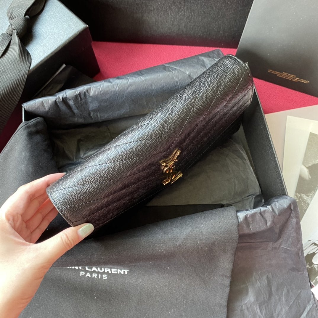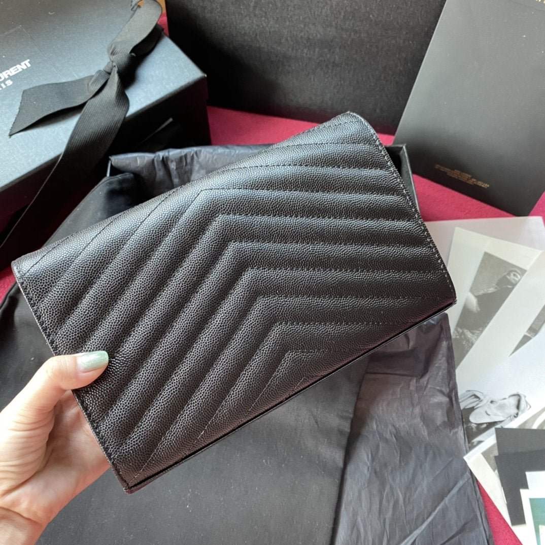 CARTERA CON MONOGRAMA SAINT LAURENT, ADORNADA CON SOLAPA EN LA PARTE DELANTERA Y CADENA METÁLICA EXTRAÍBLE, FIRMA YSL ENTRELAZADA DE METAL Y PESPUNTES ACOLCHADOS.
