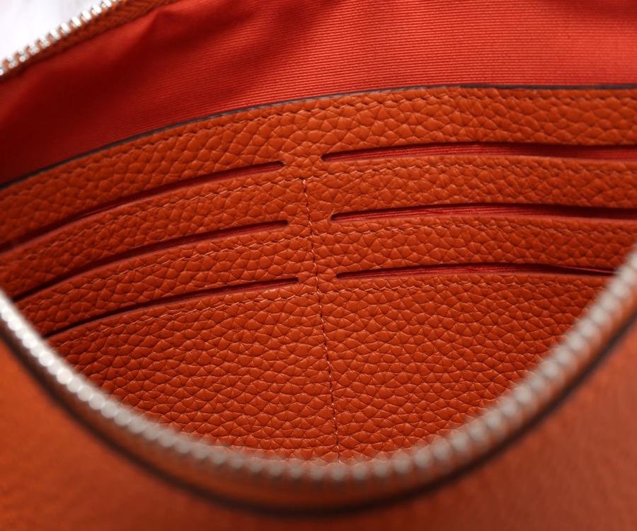 En el interior: un monedero con cremallera, 6 compartimentos para tarjetas de crédito y 1 bolsillo con cremallera.