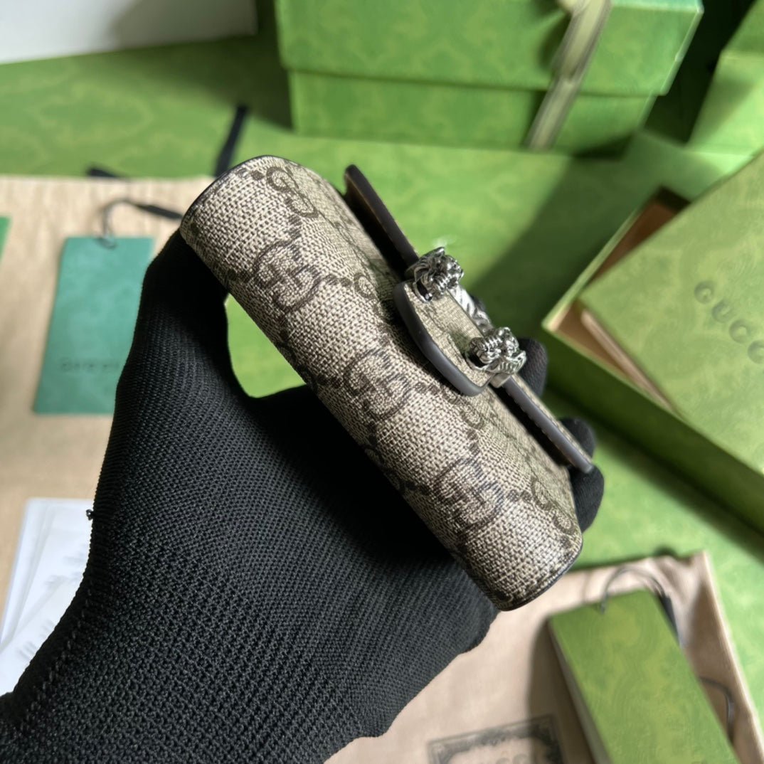 Lona GG Supreme beige y ébanoApliques de color paladioForro de moaréCabeza de tigreInterior: 2 compartimentos, 2 ranuras para tarjetas y 1 bolsillo para monedas con cremalleraCorrea cruzadaAsa de 3,5 cm de largoBandolera de 55 cm de largoCierre con broche a presión10,5 cm de ancho x 8 cm de alto x 3 cm de profundidad