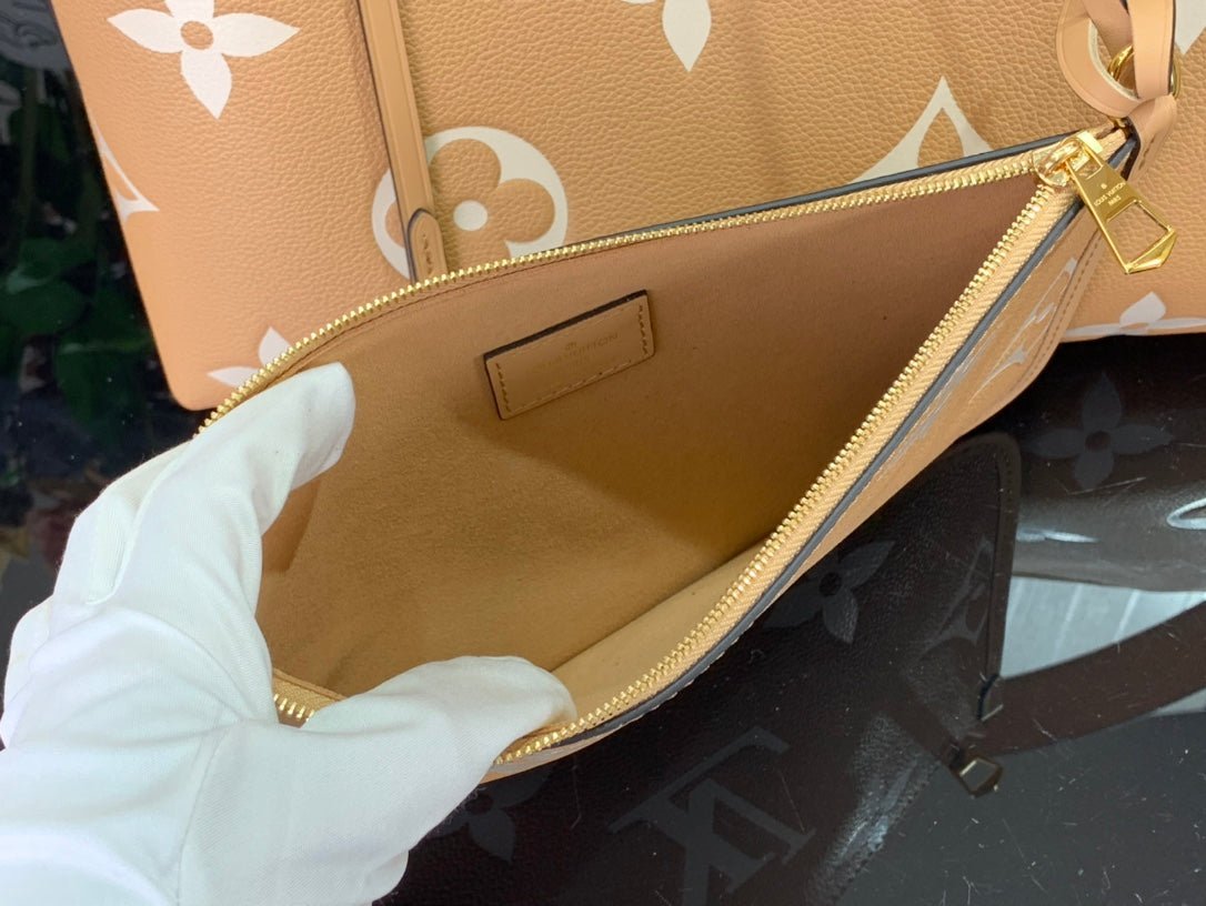 • Cartera de mano extraíble con cremallera, acoplada con un cordón en piel