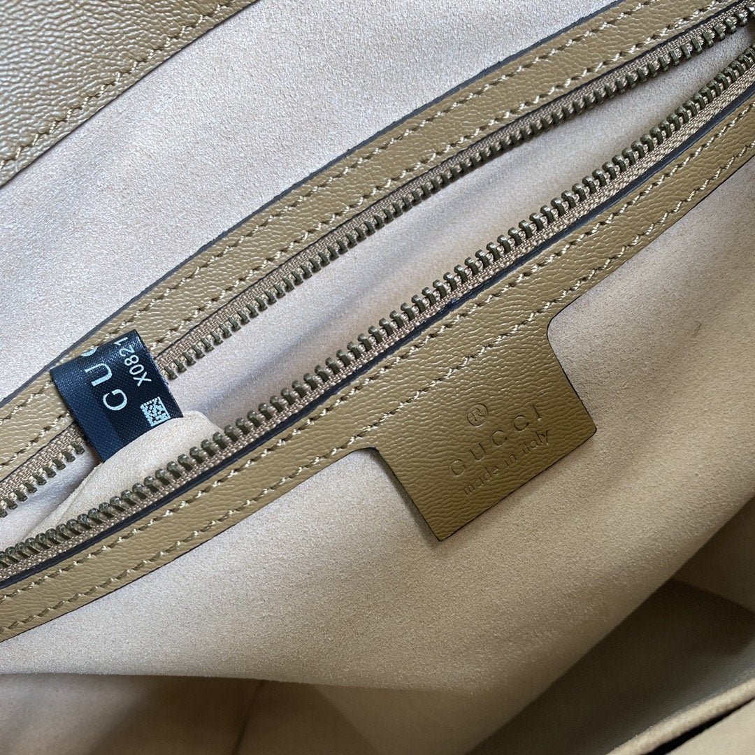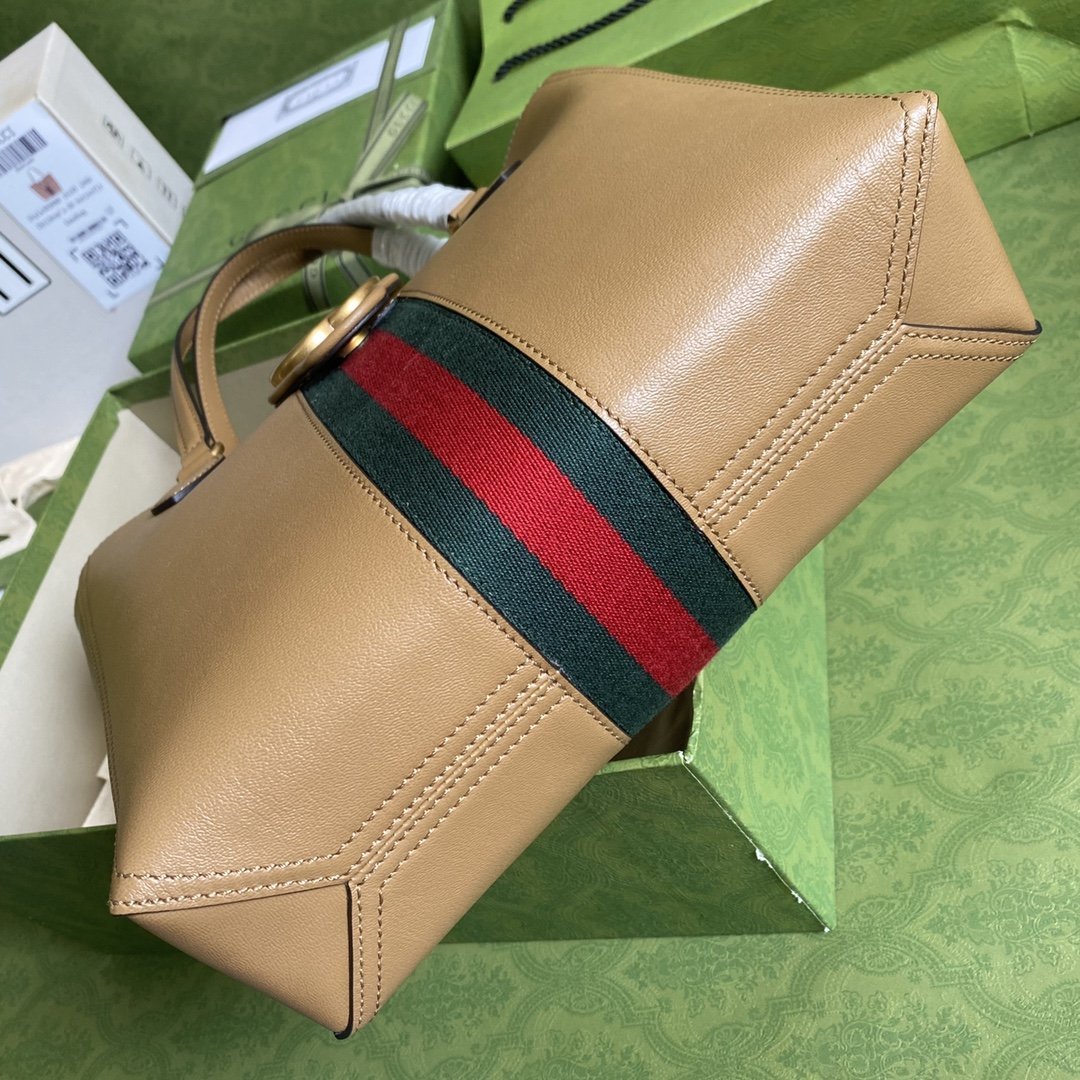 Logo Double G característico, acabado en tono dorado, detalle Web característico, dos asas largas en la parte superior, abierto en el tope, compartimento principal, bolsillos internos con cremallera y bolsillo interno. Material: cuero.