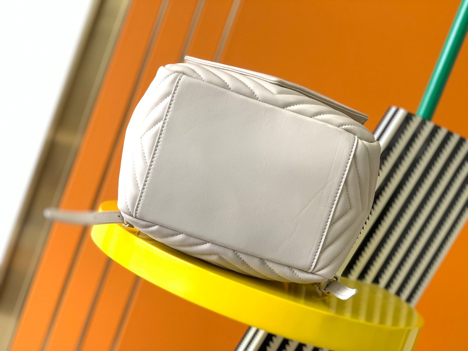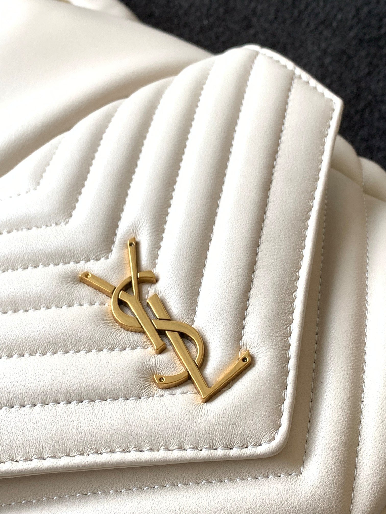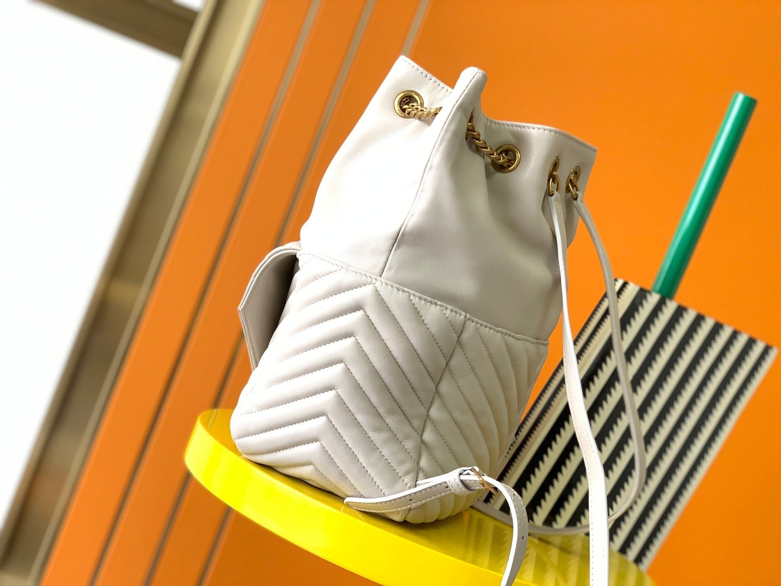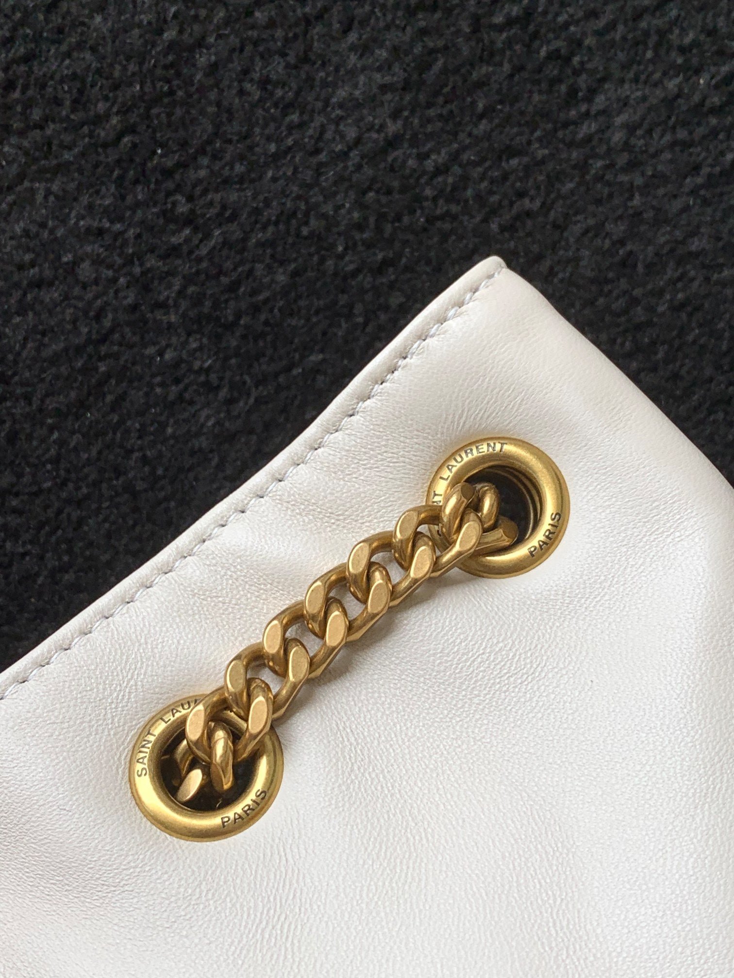 Placa característica del logo YSL, capitonado estilo chevron, dos correas de cuero y cadena para los hombros, bolsillo con solapa en la parte delantera, cierre con cordón y bolsillos internos con cierre.