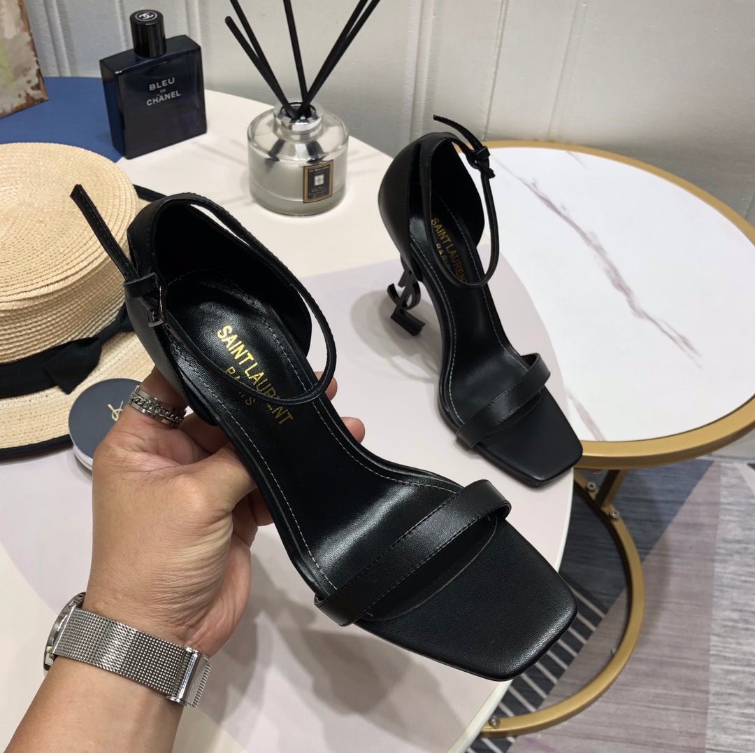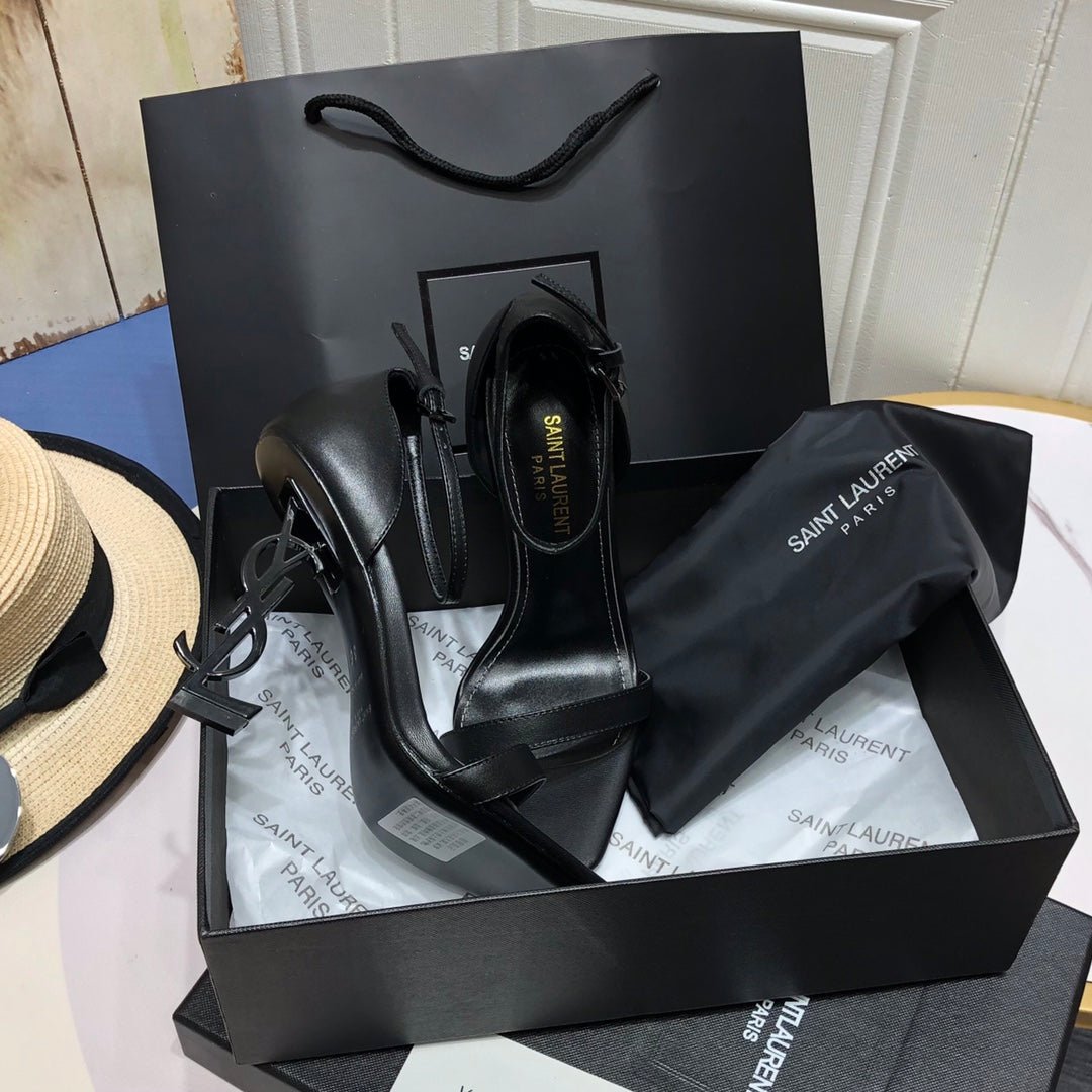 • Tacón estructurado adornado con la firma YSL de metal