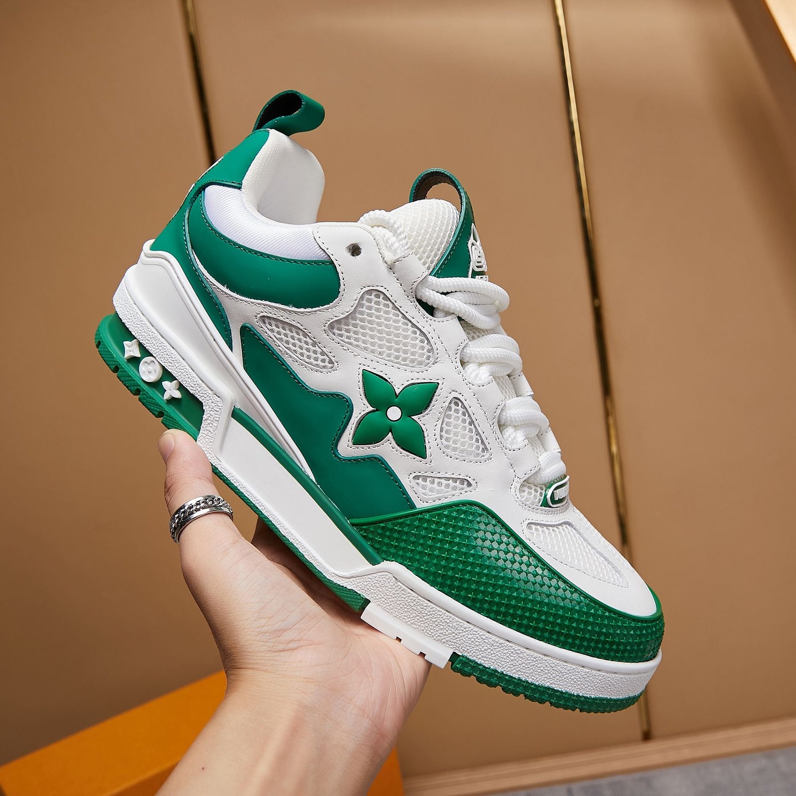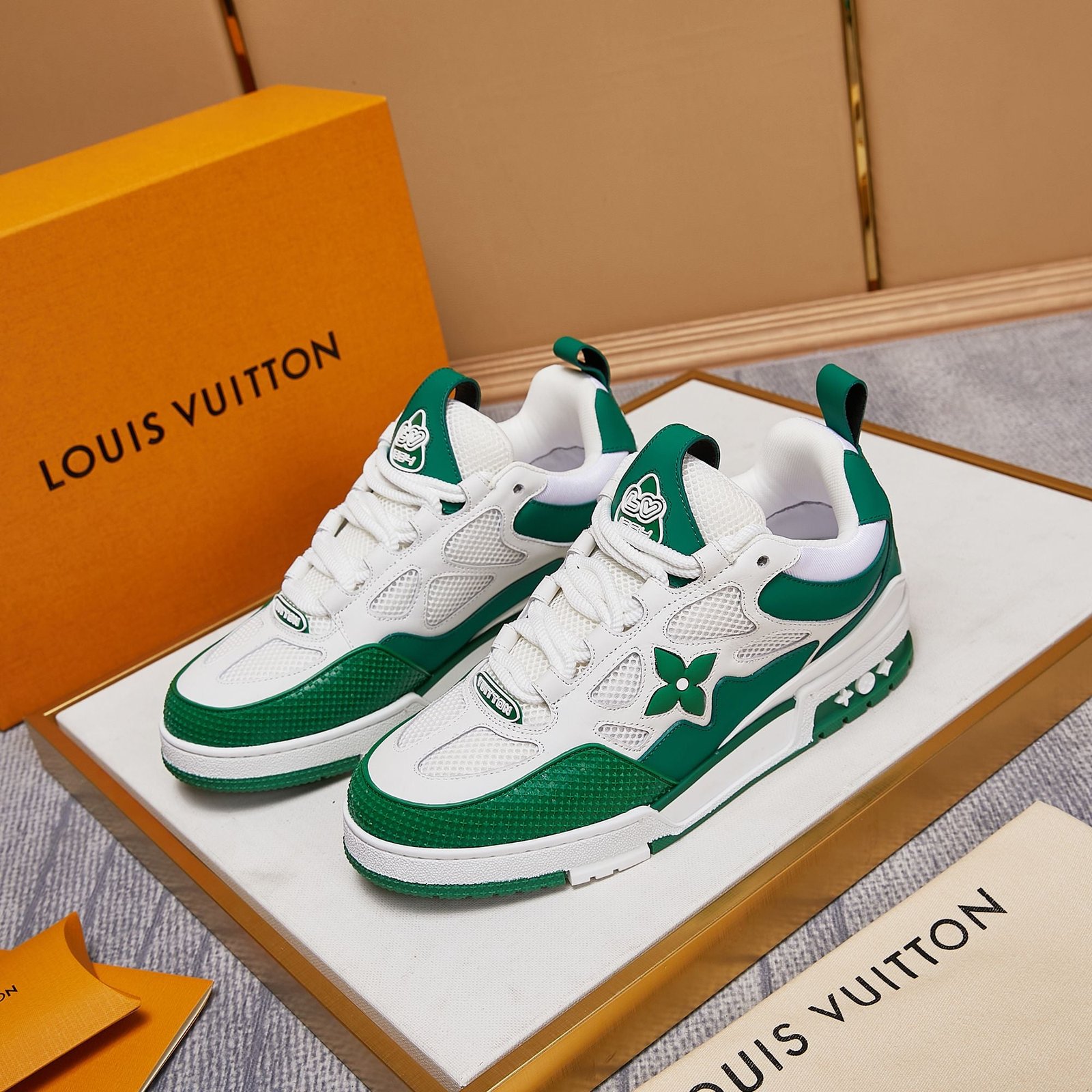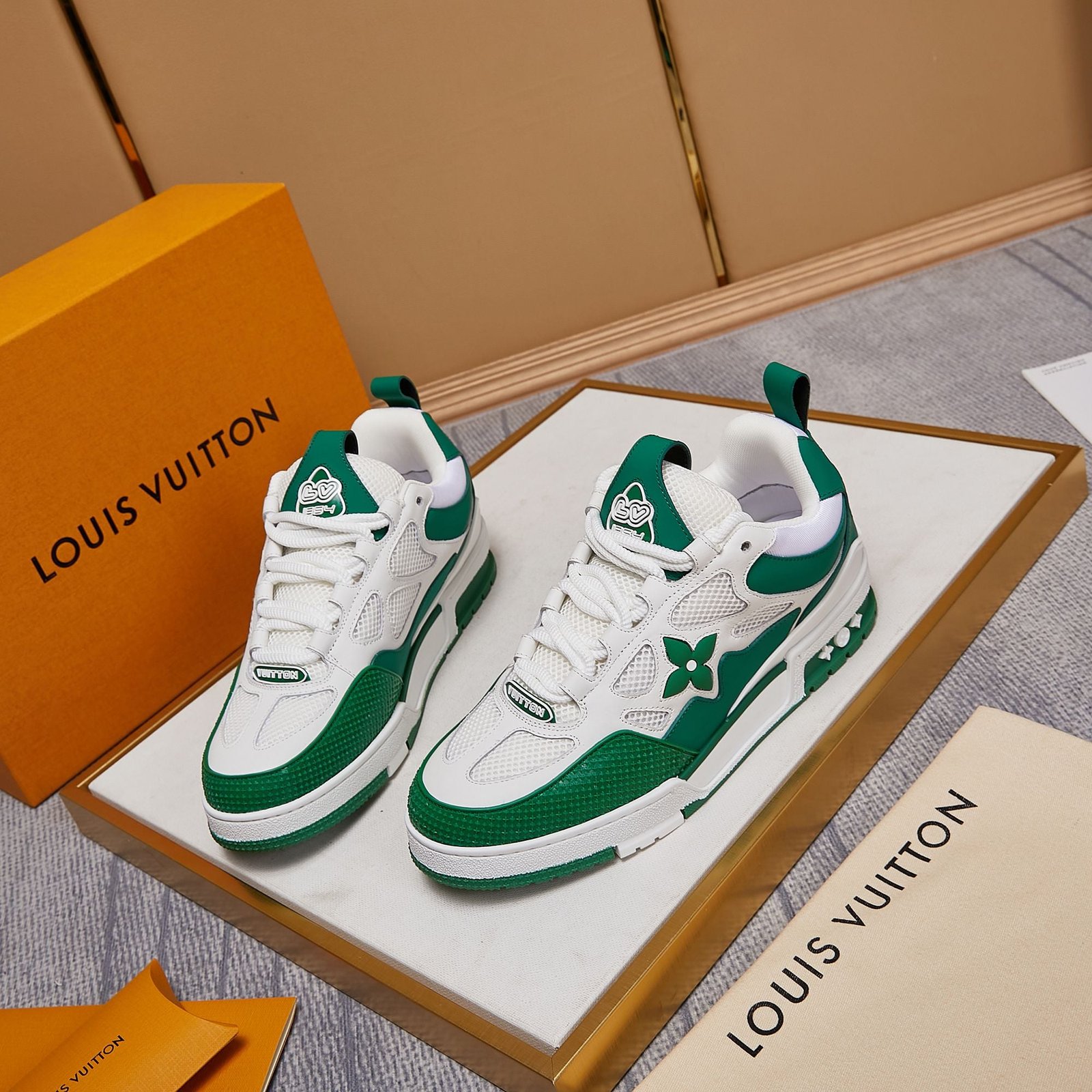 • Toques de diseño exclusivos de Louis Vuitton, como la marca ‘LV54’ en el talón que rinde homenaje al año en que se fundó la empresa, y la flor y los motivos estilo LV que se muestran en los laterales y la entresuela.
