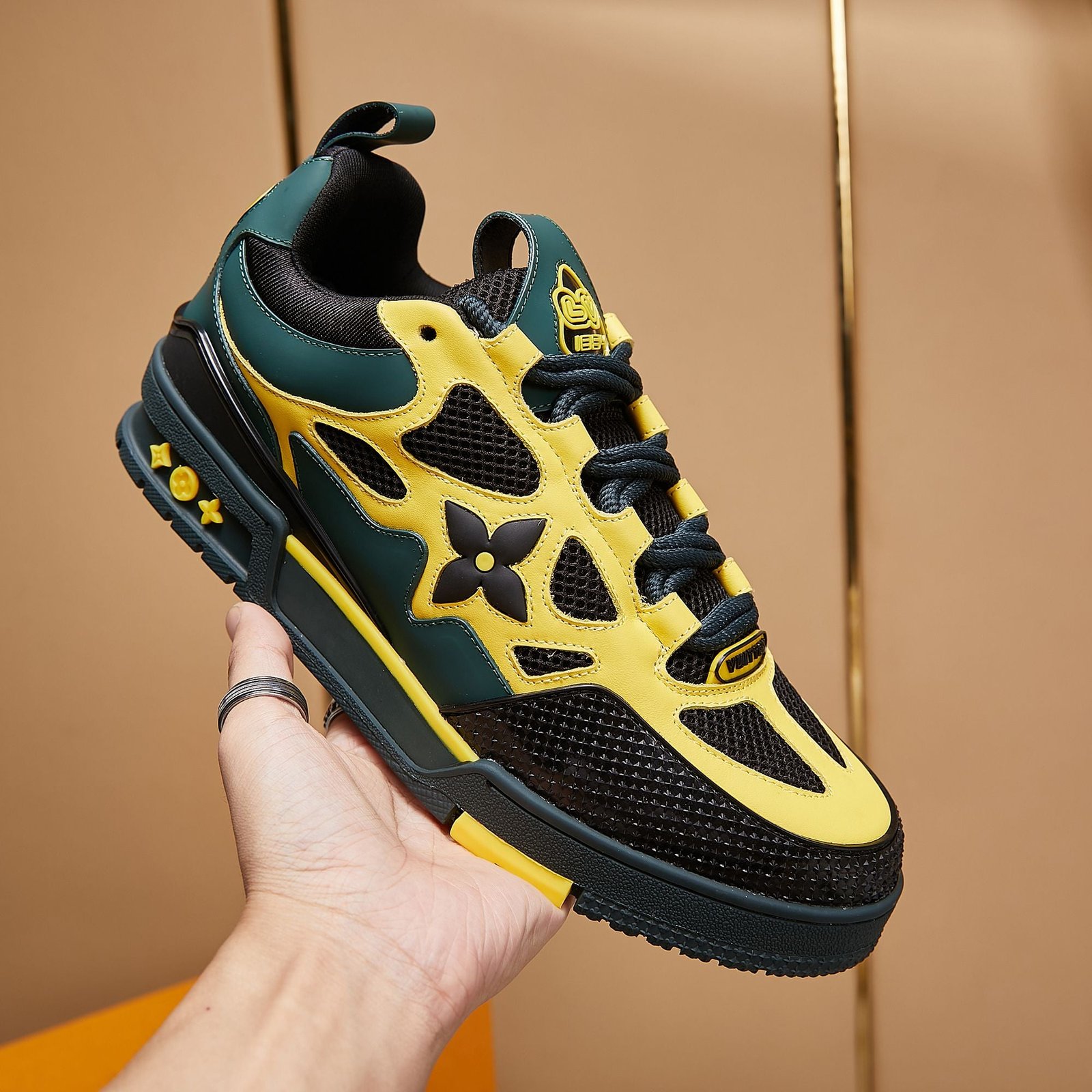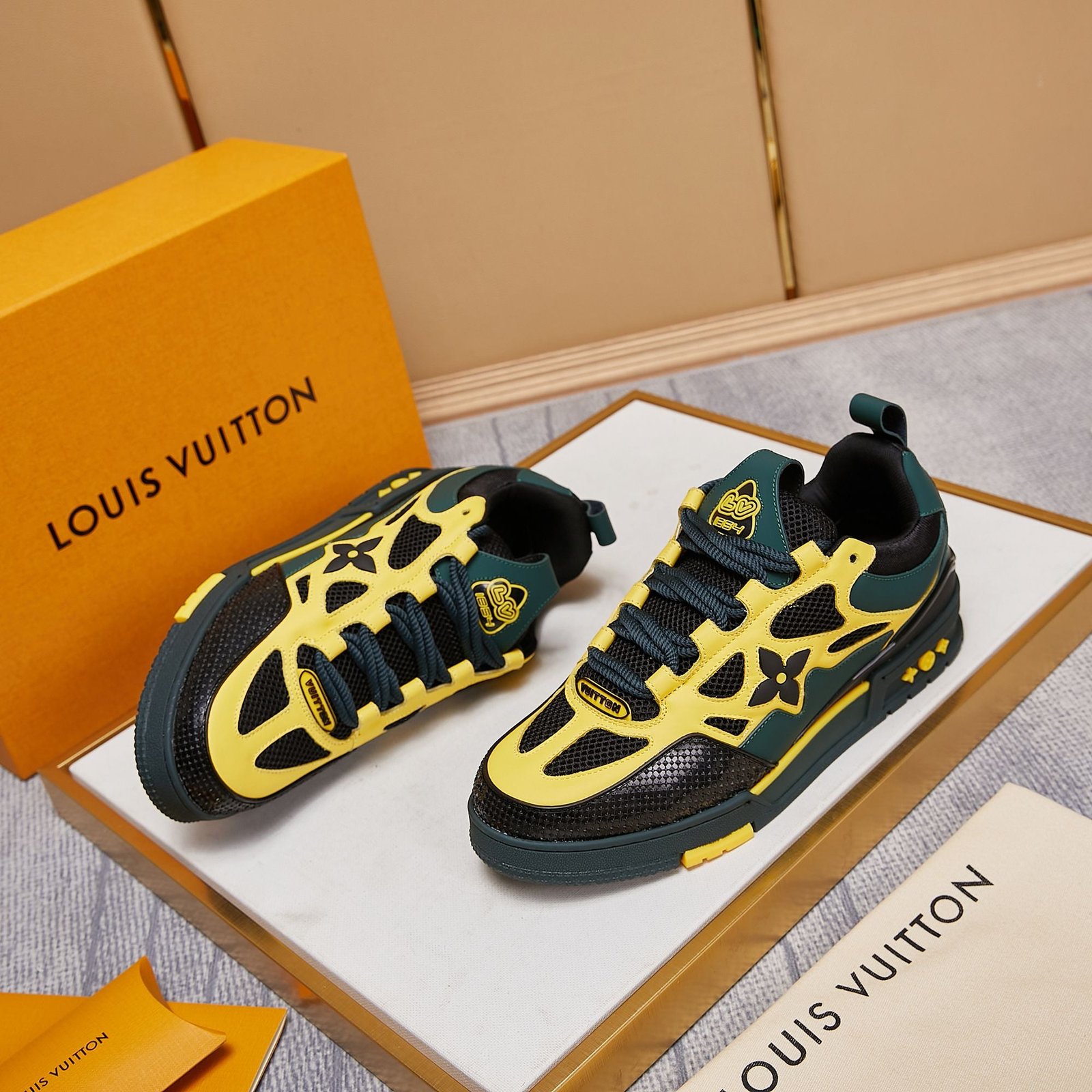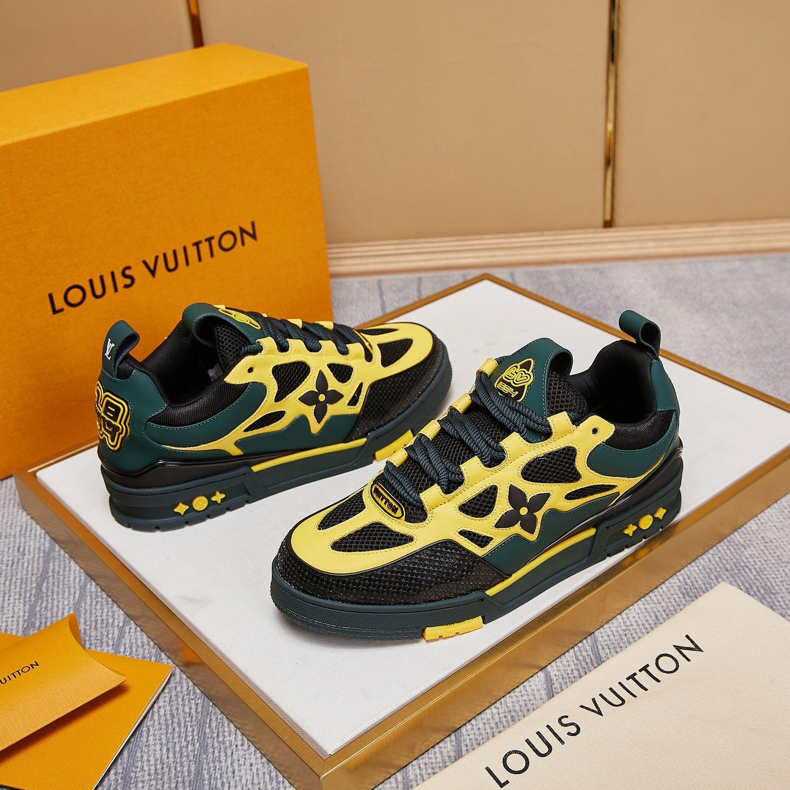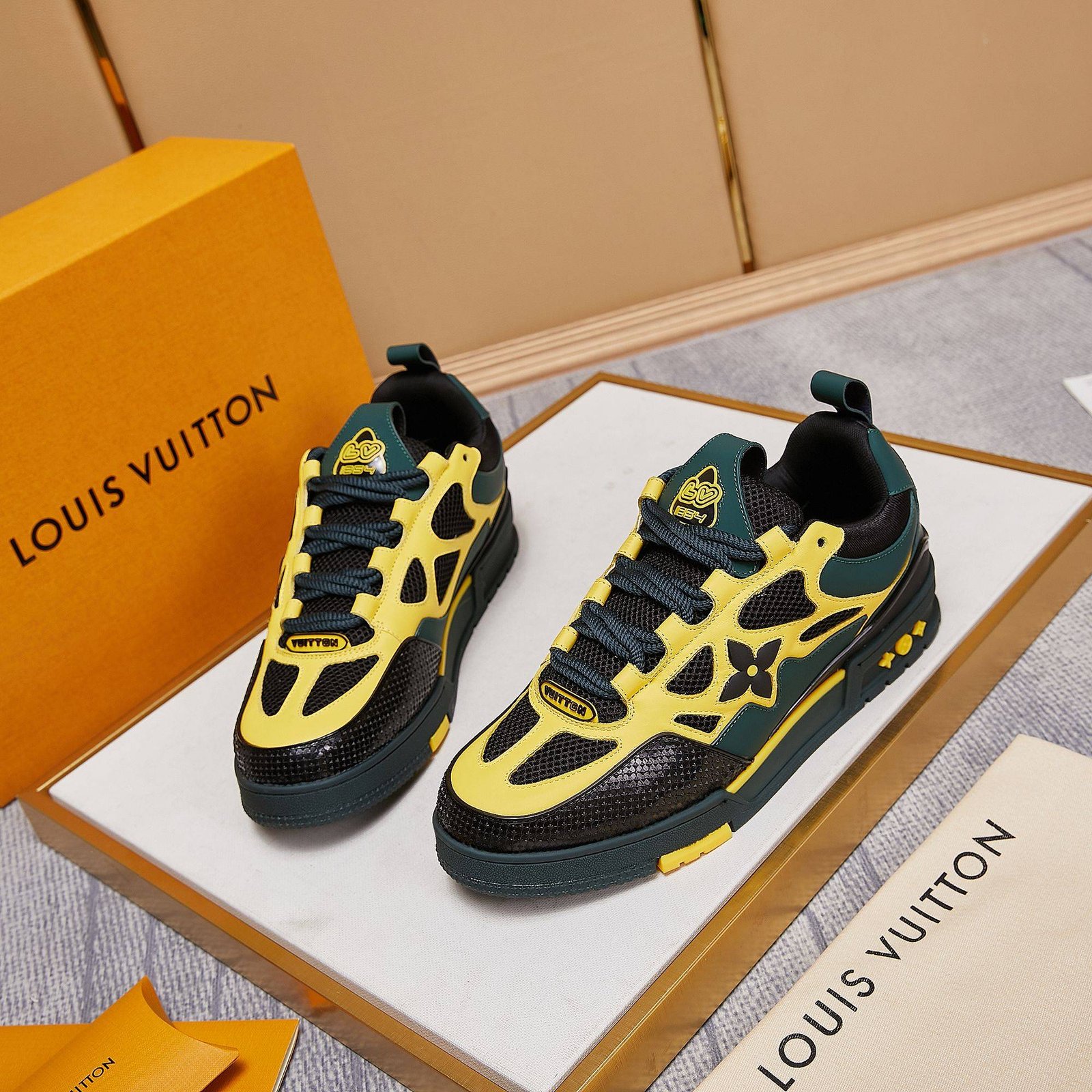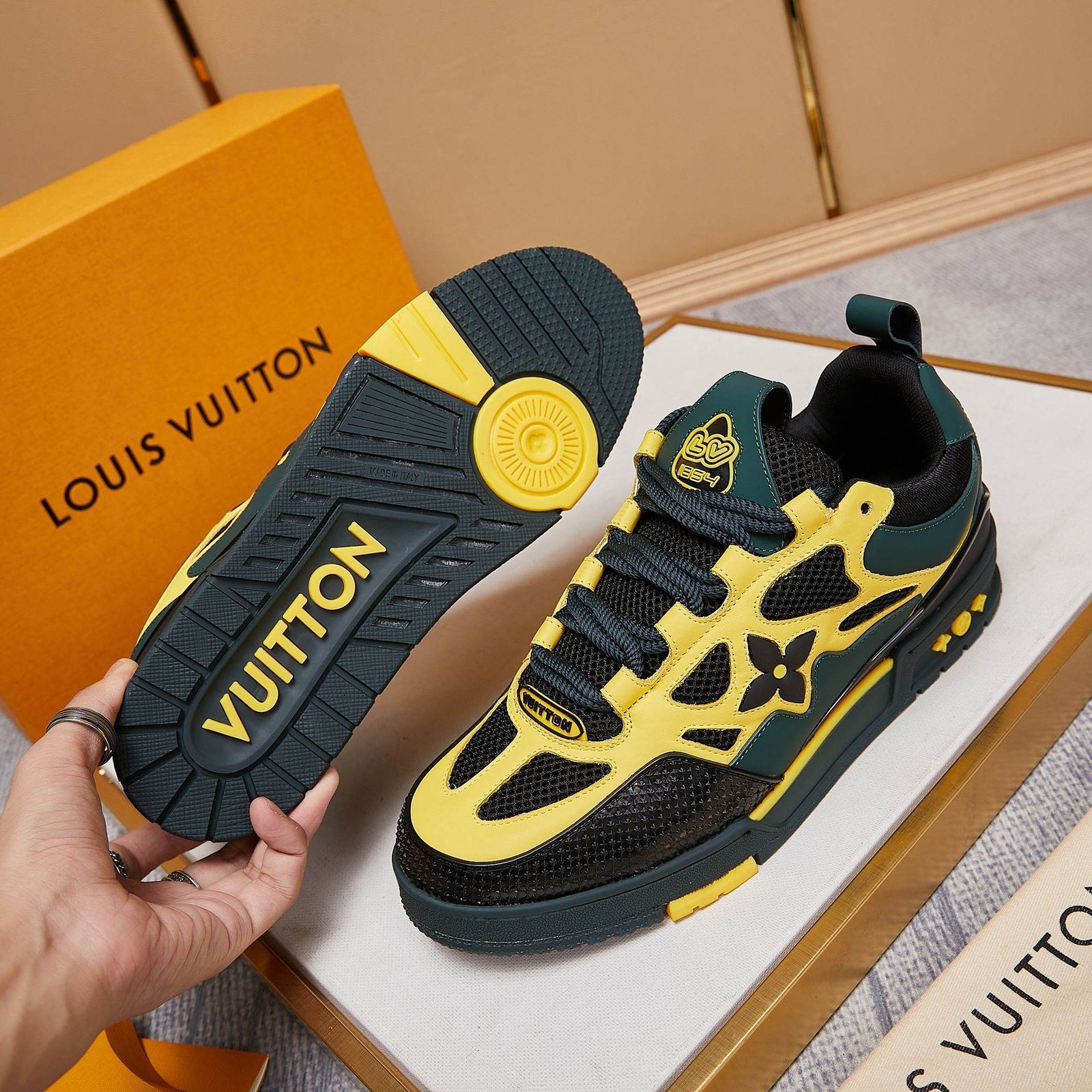 • Toques de diseño exclusivos de Louis Vuitton, como la marca ‘LV54’ en el talón que rinde homenaje al año en que se fundó la empresa, y la flor y los motivos estilo LV que se muestran en los laterales y la entresuela.